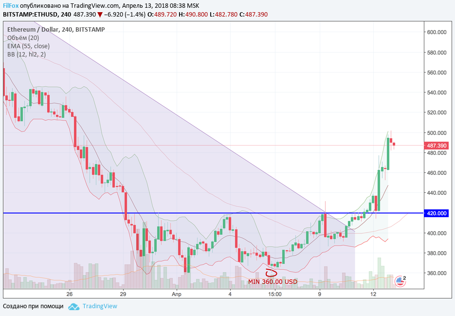 Вчера мы предположили, что бычьего запала не хватит пробить довольно сильный уровень сопротивления на отметке 445.00 USD за эфир. Но «запала» хватило, даже для того, чтобы протестировать психологический уровень 500.00 USD и установить максимум на отметке 502.00 USD. Естественно, что после столь бурного роста цена откатится к уровню поддержки 480.00 USD и постарается консолидироваться в ожидании следующего импульса. Знак этого импульса будет зависеть от Bitcoin - криптовалютного флагмана.