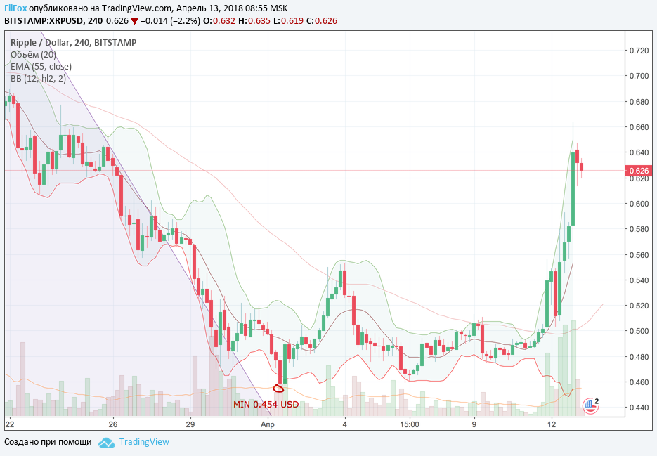 Ripple вчера покупали просто громадными объёмами. Цена взлетела, пробив уровень сопротивления 0.655 USD и устаовила максимум на отметке 0.664 USD. Правда, потом довольно быстро откатилась к уровню поддержки 0.626 USD.