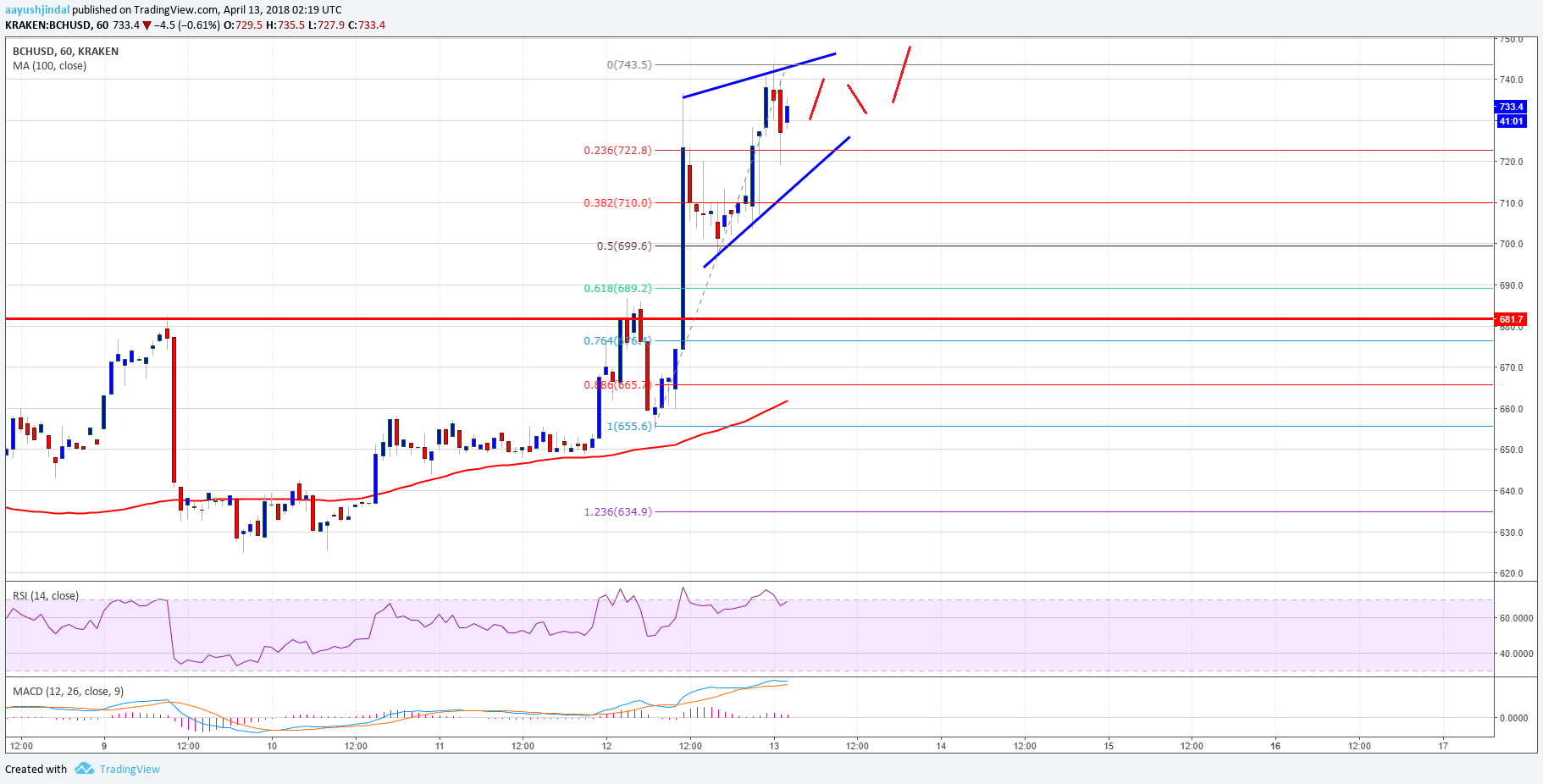 Максимум был сформирован на уровне $743, прежде чем цена начала консолидироваться. Она немного откорректировалась и протестировала уровень 23.6% фибоначчи. Однако, движение вниз было остановлено на уровне поддержки $720. На данный момент кажется, что в краткосрочной перспективе формируется паттерн бычьего прорыва с сопротивлением на уровне $745 на часовом тайм-фрейме пары BCH/USD. Если покупатели продолжат доминировать, я ожидаю, что цена превысит отметку $745 в ближайшее время.