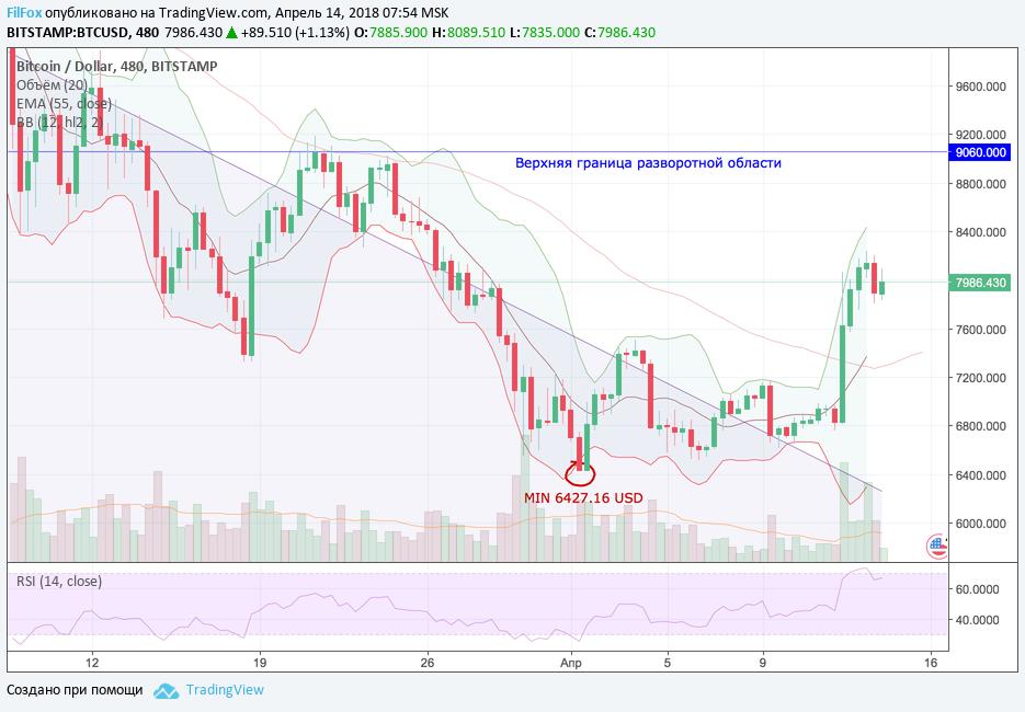 В результате прихода на рынок крупных инвест-фондов, которые заинтересовались инвестициями в криптоактивы, на рынке резко возросла волатильность криптовалют. Первый всплеск можно было наблюдать в этот четверг, 12 апреля. Мы видим, что цена сразу резко не упала после активного роста, значит движение вверх, в краткосрочном периоде, ещё может продолжиться. Необходимо определить целевые уровни сопротивления, где ещё вероятно возобновление тенденции снижения.