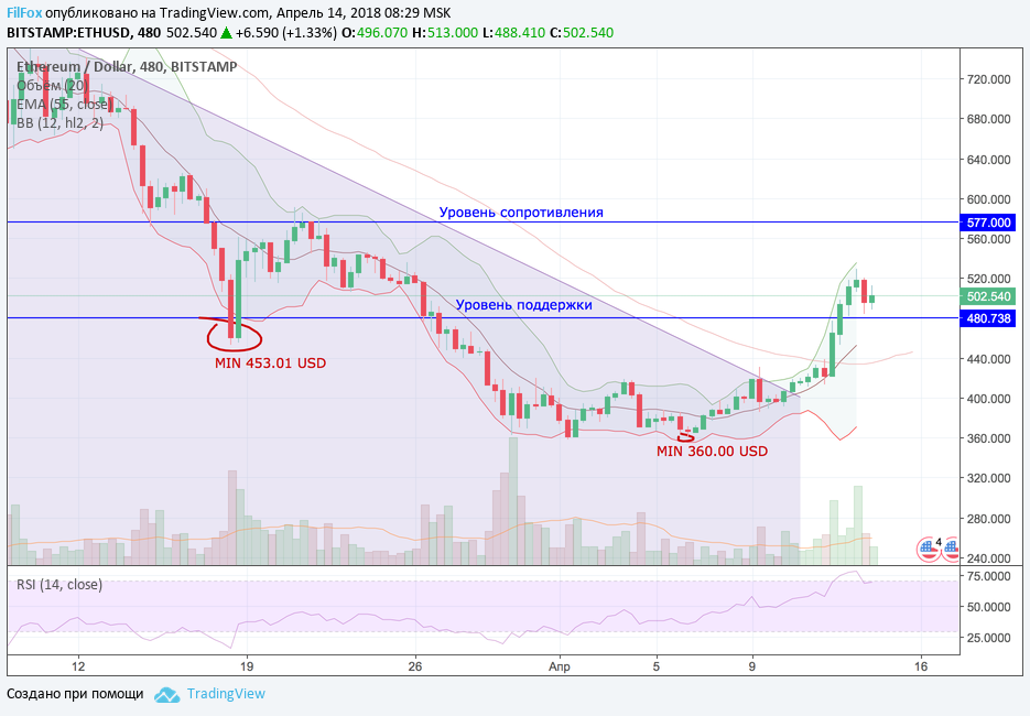 Ethereum вчера установил дневной максимум на отметке 529.36 USD и откатился к уровню поддержки 480.00 USD. Показатель относительной силы RSI за это время вышел из зоны перекупленности и находится, в данный момент, на границе с нейтральной зоной. Полагаем, что дальнейшая консолидация будет продолжаться над обозначенным уровнем поддержки, а рост в краткосрочном периоде, ограничится уровнем сопротивления на отметке 577.00 USD.