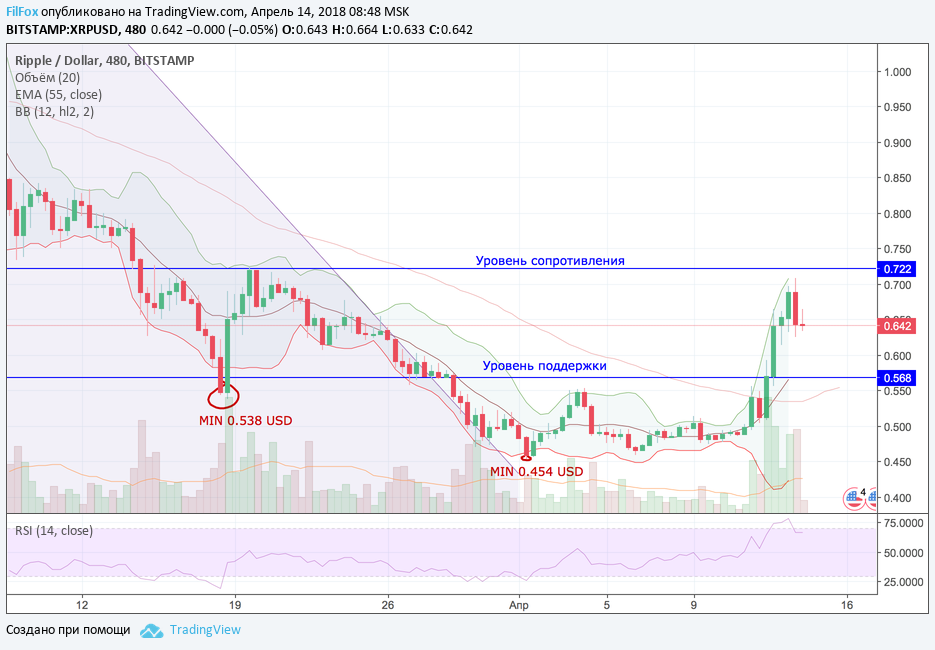 Ripple вчера активно покупали большими объёмами, в итоге, когда цена установила локальный максимум на отметке 0.708 USD, большие объёмы появились на продажах. Показатель RSI вернулся из зоны перекупленности на уровень 66%. После завершения отката, рост в краткосрочном периоде будет ограничиваться разворотным уровнем сопротивления, который не удалось пробить в период коррекции, начавшейся 18 марта. А снижение курса пока будет происходить в пределах поддержки 0.568 USD.