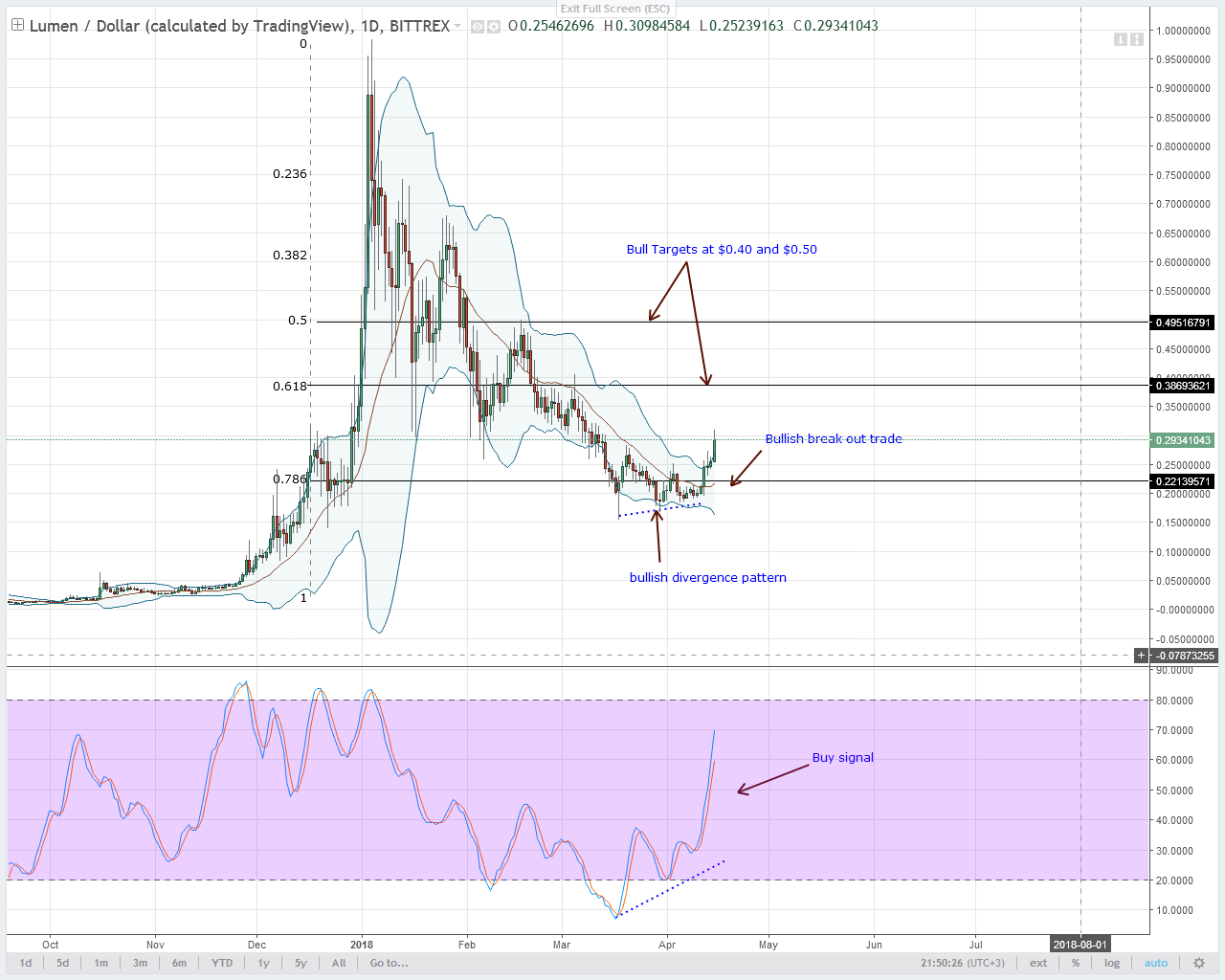 Только за последние 24 часа цена Stellar Lumens выросла на 16.28%. За последние три недели рост цены составил 44.68%. Если говорить о графиках, то на дневном тайм-фрейме мы можем увидеть четкую картину ценового действия, быки доминируют. Оцените эти бычьи свечи вдоль средней BB и вы поймете, что все, что нам нужно сделать - искать возможности для покупки в нижних точках.