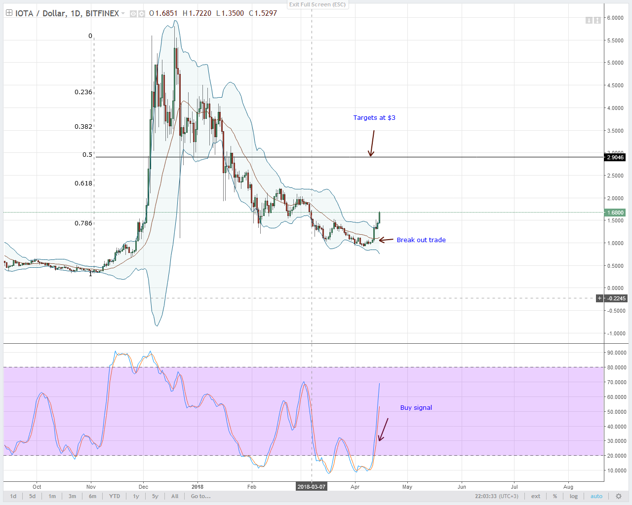 Я рекомендовал бы ожидать провалов на малых тайм-фреймах и размещать лонги. Наша краткосрочная линия поддержки находится на отметке $1.45. Если цены упадут, подождите сигнала стохастика на покупку и покупайте IOTA с целью на $3.