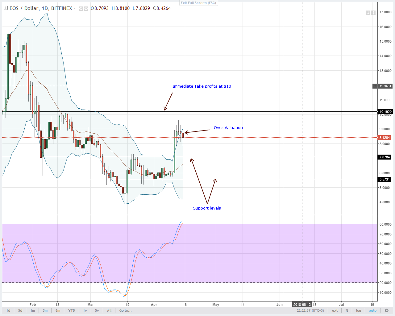 На графиках мы видим, что рост EOS составил 43.24% за последние 7 дней. Несмотря на то, что цены в основном растут, график показывает наличие переоценки. Посмотрите на свечи 12-14 апреля, которые находятся выше средней BB и на вчерашнюю медвежью свечу. Советую воздержаться от торговли данным альткоином и подождать пока цены откорректируются до $6.5-$7, прежде, чем искать возможности купить на четырёхчасовом тайм-фрейме.