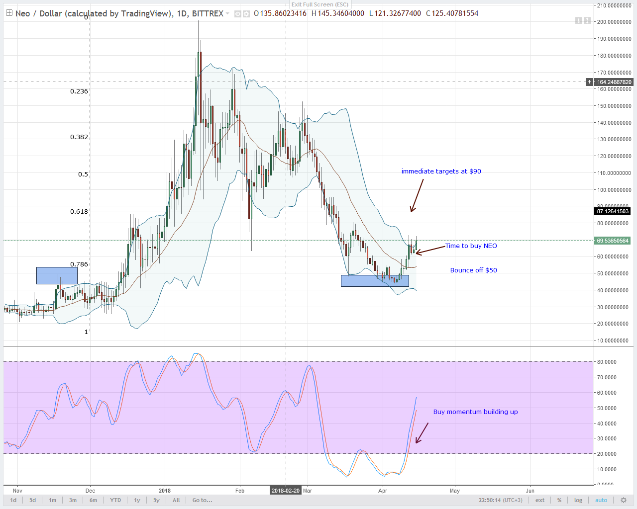 Несмотря на то, что цена NEO выросла на 45% за эту неделю, я ожидаю, что цена пойдет вниз. Потенциальные зоны покупок находятся возле отметок $60 с бычьими целями на $90, как в нашем прошлом теханализе.