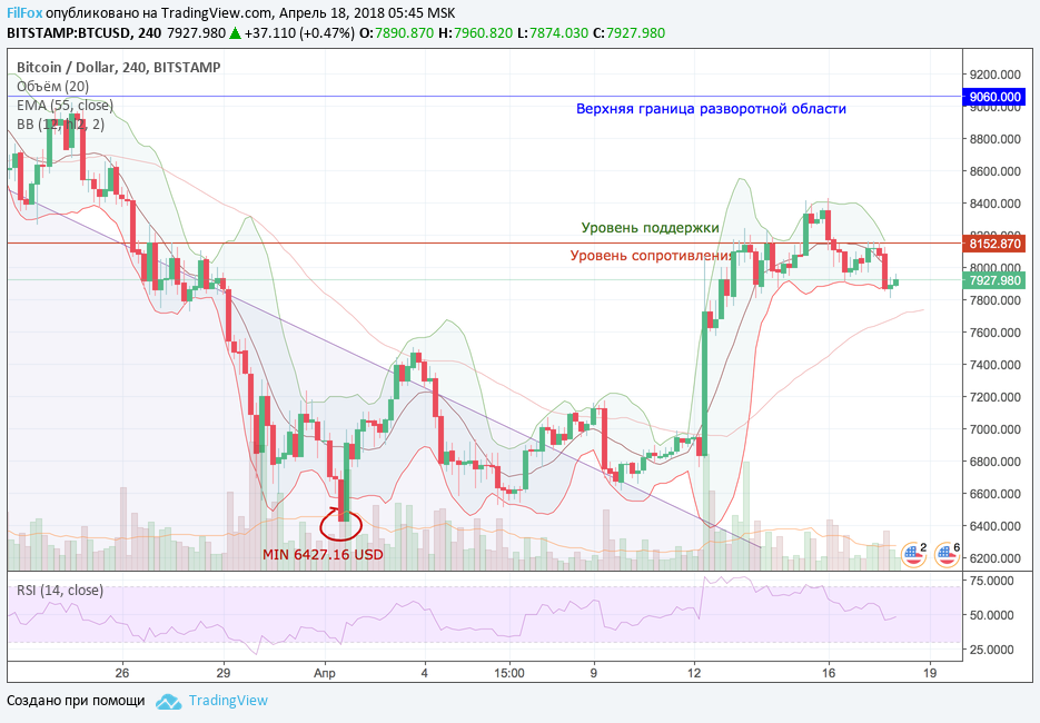 Сегодня после восстановления в область восьми тысяч цена, вновь начнёт снижение к уровню поддержки в виде EMA55 (7700.00 USD).
