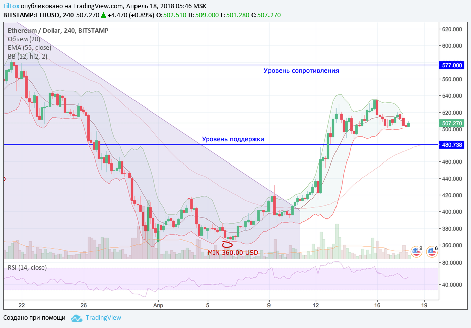 Ethereum вчера консолидировался возле уровня 512.00 USD. Дневной максимум был установлен на отметке 521.00 USD, а постепенное снижение к уровню поддержки 480.00 USD замедлилось на психологической отметке 500.00 USD. Сегодня на этом уровне проходят покупки, но пока их объёмы не значительны. Полагаем, что постепенное снижение к уровню 480.00 USD вскоре возобновится.