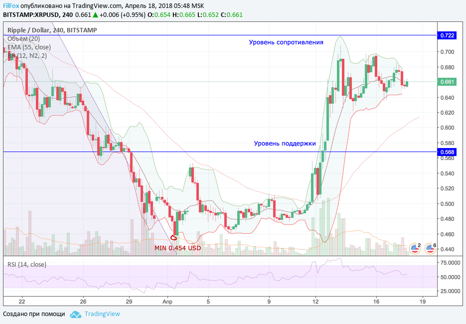 Ripple вчера, после дневного максимума на отметке 0.685 USD, вновь снижался к нижней границе BB (Bollinger Band). Снижение замедлилось на силовой границе 0.666 USD. Рипл только проколол её, установив локальный минимум 0.650 USD. Предполагаю, что консолидация вокруг отметки 0.666 USD будет продолжаться и сегодня.