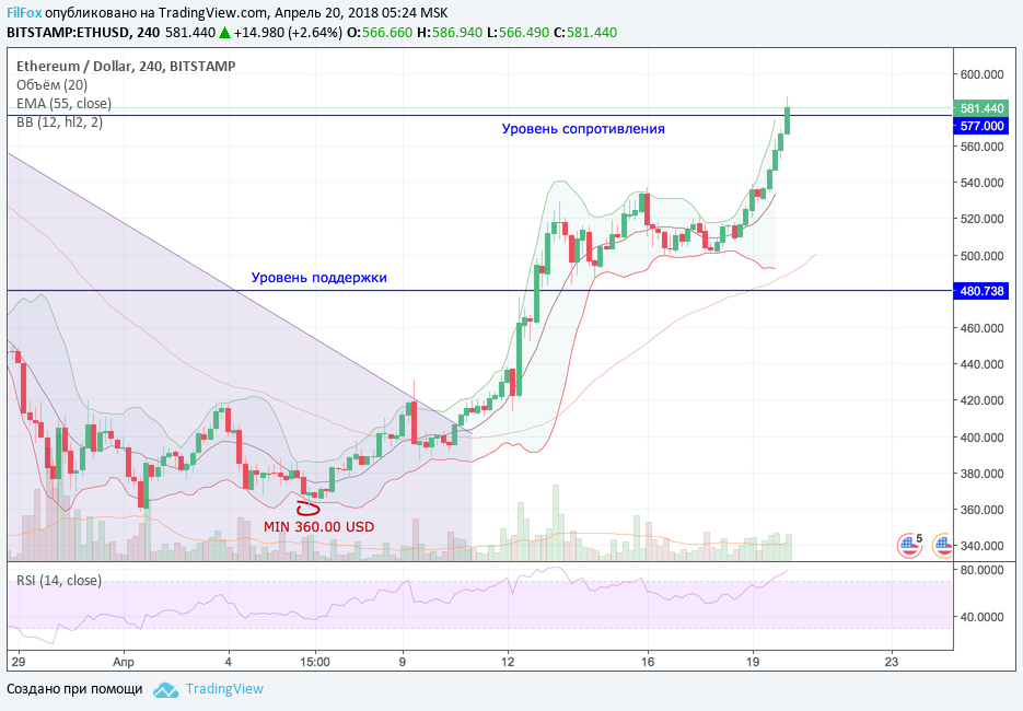 Ethereum вчера смог обновить апрельский максимум, передвинув его на отметку 563.00 USD. А сегодня, утром эфир пошел ещё дальше и проколол уровень сопротивления 577.00 USD, установив месячный максимум, примерно, на 587.00 USD. Естественно показатель относительной силы RSI зашкаливает в зоне перекупленности. Дальнейший рост пока мало вероятен. Цена откатится к уровню поддержки на отметке 537.00 USD.