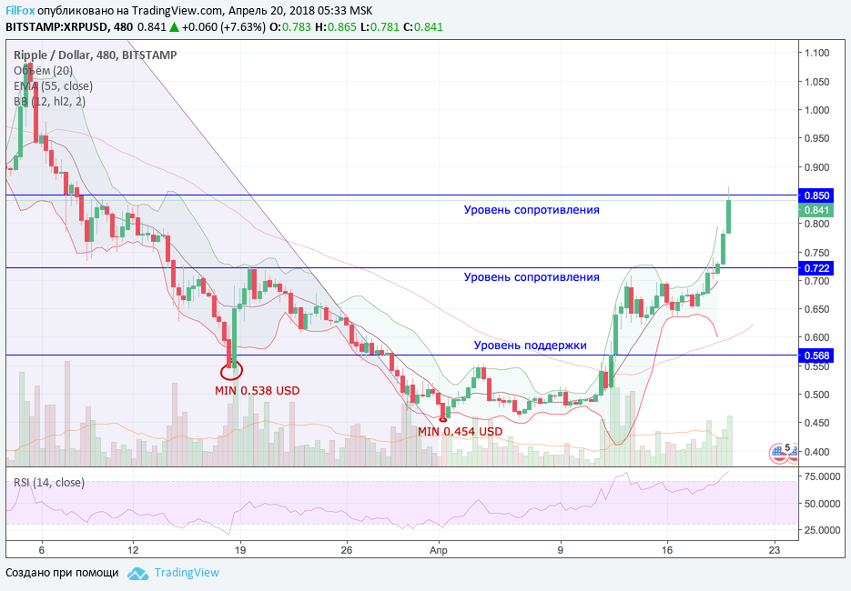 Больше всех вчера старался Ripple. Преодолев дневной максимум на отметке 0.740 USD, рипл не остановился на достигнутом и поздно вечером обновил его до уровня 0.789 USD. Но и это ещё не всё. Сегодня утром максмум уже «красовался» на новой вершине. На очень больших объёмах покупки, цена пробила уровень сопротивления 0.85 USD и установила пятничный максимум на отметке 0.865 USD.