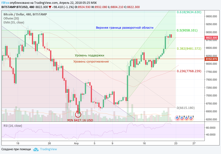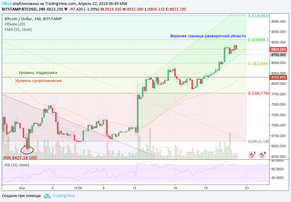 С тех пор, как 12 апреля, Bitcoin стартовал от уровня 6800.00 USD и сказал: «Поехали!», его курс вырос до отметки 9023.00 USD. На протяжении текущей недели разворачивалась борьба Тянитолкая в боковом диапазоне, возле ключевого уровня 8152.87 USD.
