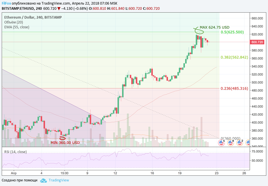 На этой неделе в динамике пары ETH/USD присутствовало явно выраженное бычье настроение. Цена от психологического уровня 500.00 USD за эфир смогла вырасти приблизительно на 23%, до апрельского максимума 624.75 USD. Но преодолеть сопротивление пятидесяти процентного уровня фибоначи (625.00 USD) пока так и не удалось. Вчера цена откатилась к уровню 38.2% фибо, установив дневной минимум 573.00 USD.