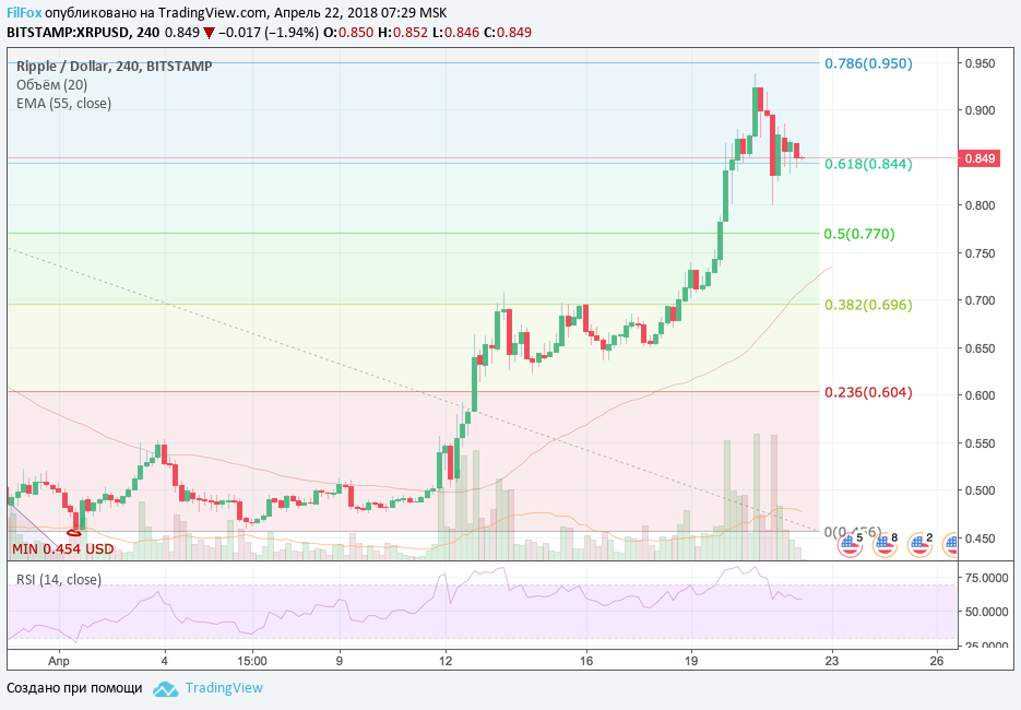 Всю неделю Ripple показывал неплохой рост, однако установив максимум на отметке 0.938 USD, обозначил окончание сорока процентного прибавления в курсе. Цена вплотную подобралась к психологическому уровню «один доллар за рипл», но вчера не смогла преодолеть сопротивление 78.6% фибо (0.95 USD). Она существенно просела, пробив уровень поддержки 61.8% фибо (0.844 USD) и установила дневной минимум 0.799 USD.