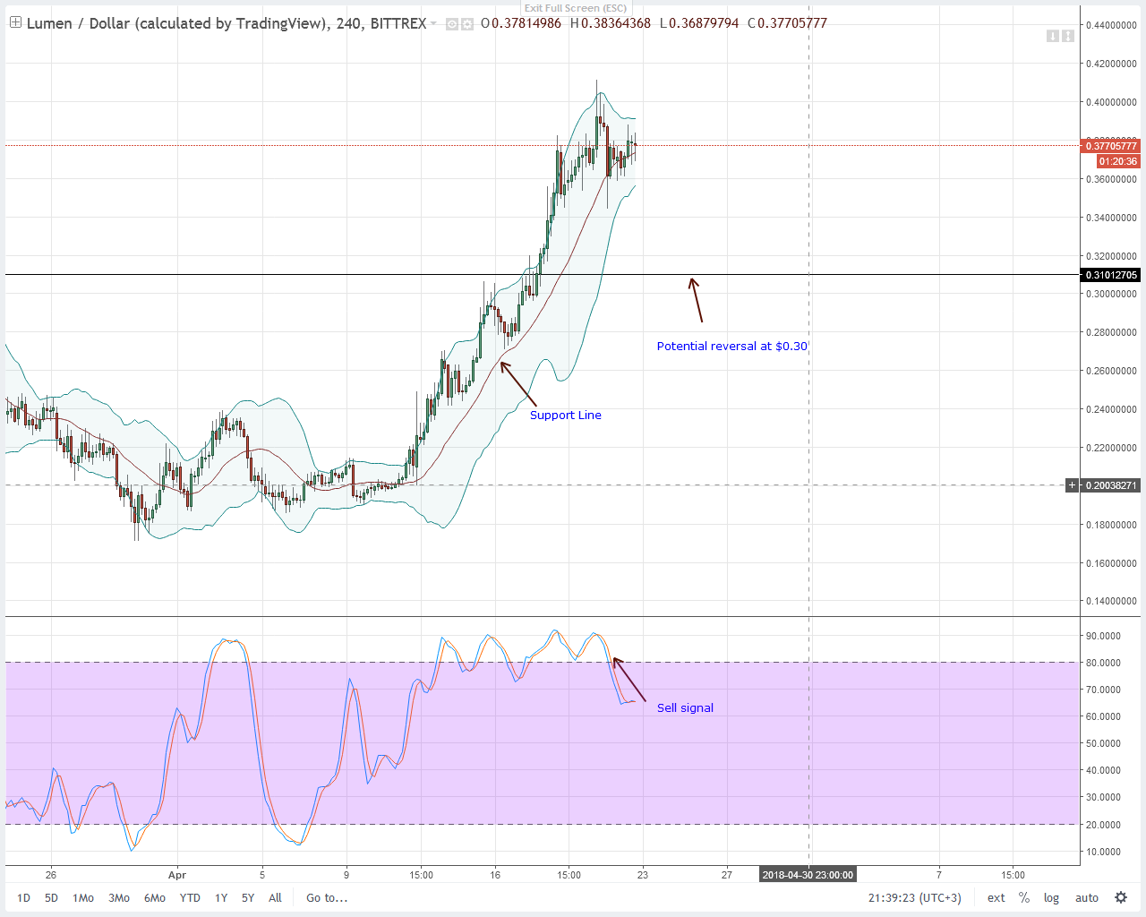 За последние 24 часа цена Stellar Lumens поднялась на 2.37%. Технически на данный момент цены движутся горизонтально. Существует высокая вероятность того, что медведи продавят цену ниже, как описывалось в нашем предыдущем прогнозе. Так что если в ближайших сессиях цена не достигнет $0.40 я бы рекомендовал краткосрочные продажи с целями на отметке $0.30 или в любой момент, когда появится сигнал стохастика на покупку.