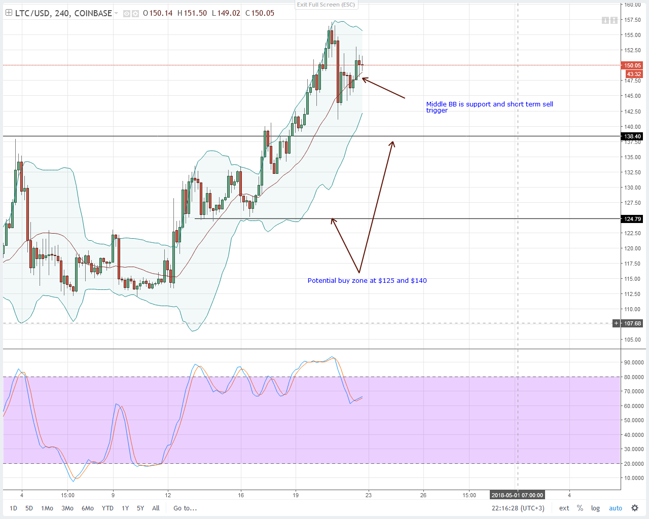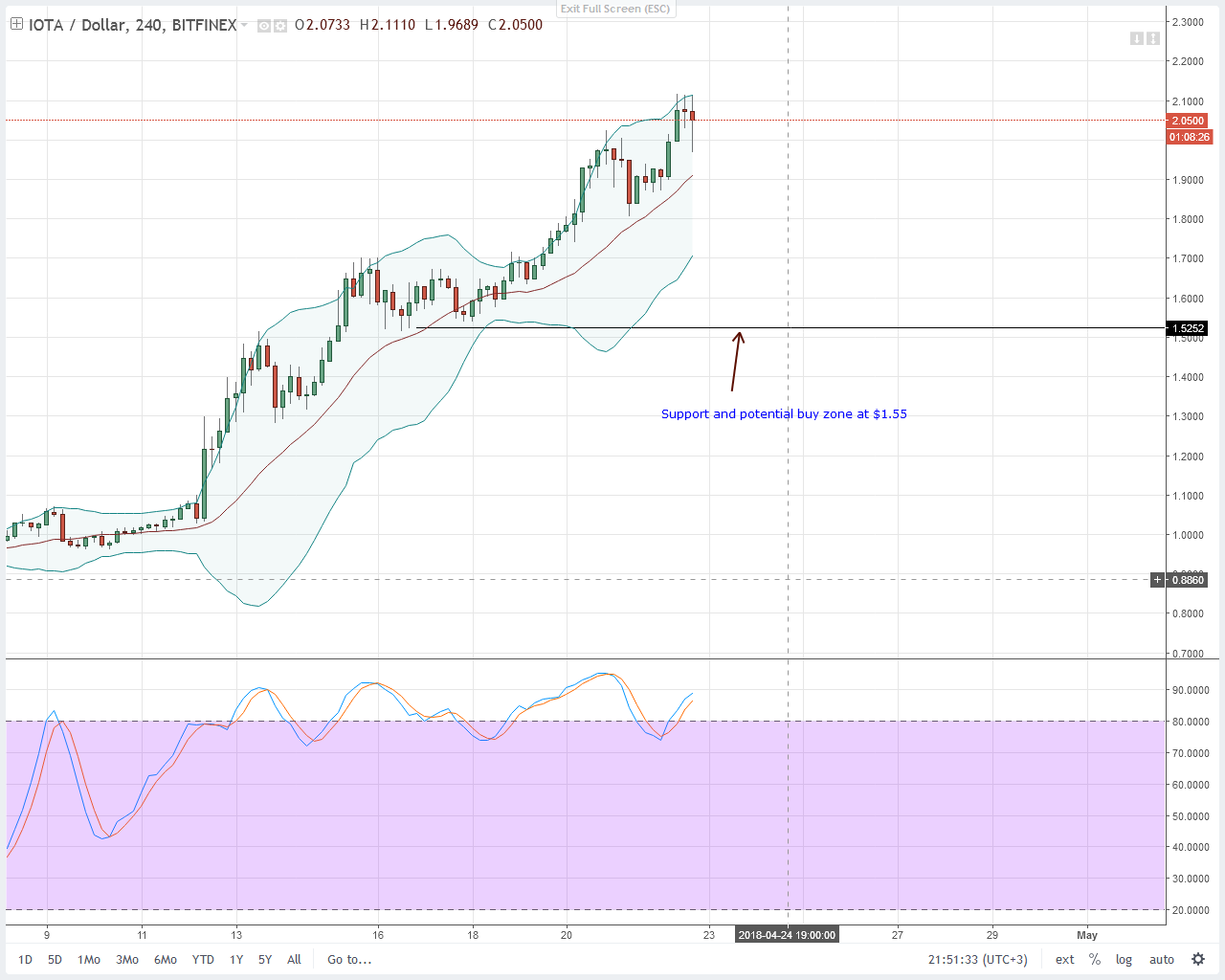 Цена NEO по-прежнему колеблется в пределах медвежьей свечи 21 апреля. На данный момент существуют шансы того, что цены могут упасть ниже 20 MA, потому как стохастик четырехчасового тайм-фрейма бычий. Если цены не пробьют отметку максимума 20 апреля в $80, я бы был настроен на продажи и думаю, что цены могут развернуться на отметке $65 или $70.