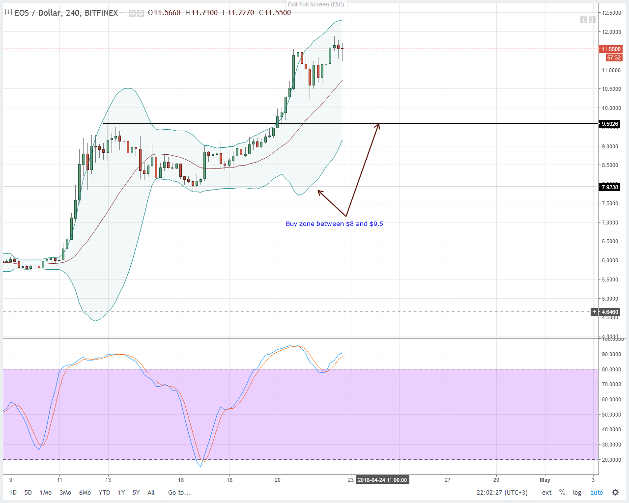 Я, по-прежнему, придерживаюсь предыдущего прогноза и рекомендую дождаться сигнала стохастика на покупку. На мой взгляд, покупка на провалах - хорошая стратегия в этом случае, если вы планируете наращивать количество криптовалюты к выпуску EOSIO в июне 2018. Идеальные зоны для покупок находятся между $8 и $9.5.