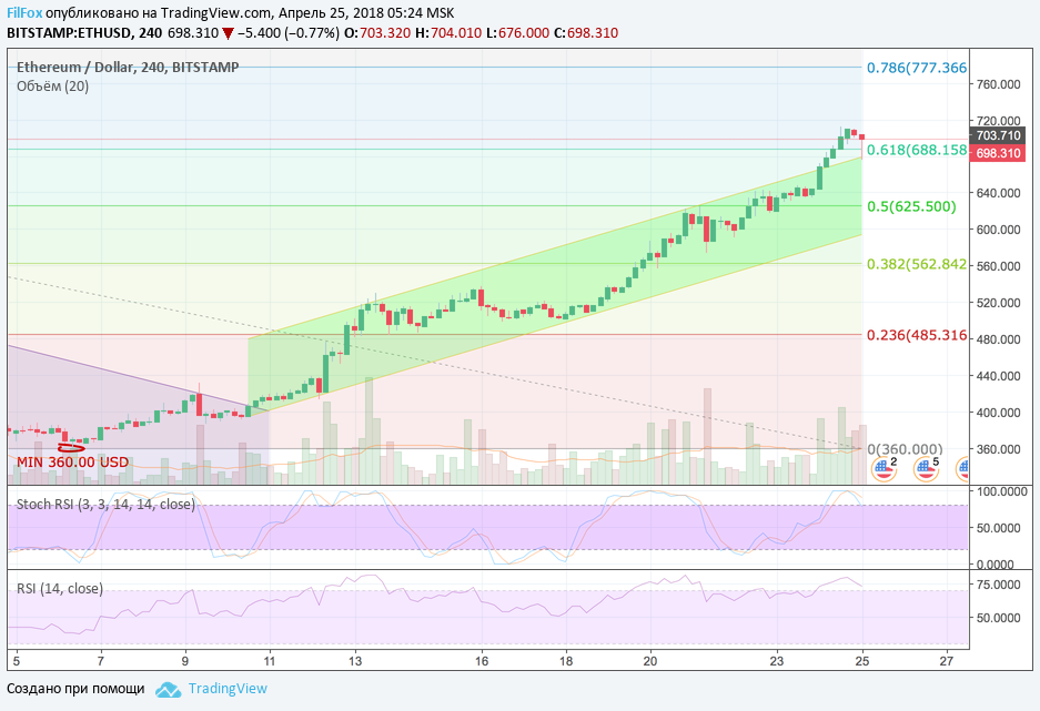 Вчера Ethereum, при поддержке крупных игроков, добрался до целевого уровня 61.8% (688.10 USD) и установил максимум на отметке 711.00 USD. Однако закрепиться выше этого уровня пока не удалось. На диаграммах объёма можно видеть крупные продажи. Цена откатилась к уровню поддержки фибоначи 61.8% (688.10 USD), но вряд ли сможет за него зацепиться надолго.