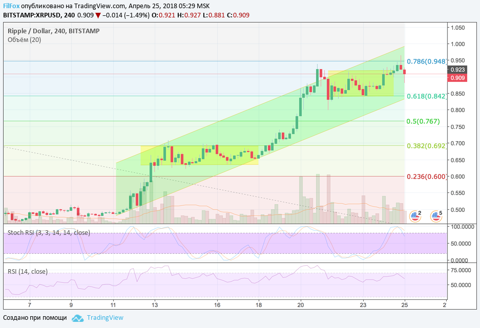 Ripple вчера вышел из диапазона «прямоугольника» и слабым бычьим импульсом протестировал уровень сопротивления 78.6% фибо (0.950 USD), установив максимум на отметке 0.965 USD. Сегодня цена рипл откатилась ниже этого уровня сопротивления и на снижении ищет поддержку в районе 61.8% фибо (0.842 USD).