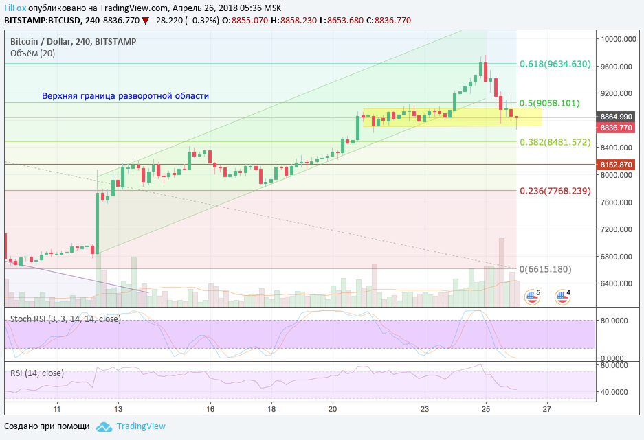 После того как вчера цена Bitcoin передвинула апрельский максимум на отметку 9755.53 USD, попытки протестировать психологический уровень 10000.00 USD закончились, даже не начавшись. Цена в течение всего дня снижалась, пытаясь зацепиться за какой-нибудь уровень поддержки. Уровень 50% фибоначи (9058.00 USD) не смог остановить падение цены, а лишь немного её замедлил. Пара BTC/USD пробила этот уровень и вошла в границы диапазона прямоугольника, в котором консолидировалась три дня подряд, перед тем, как установить последний апрельский максимум.