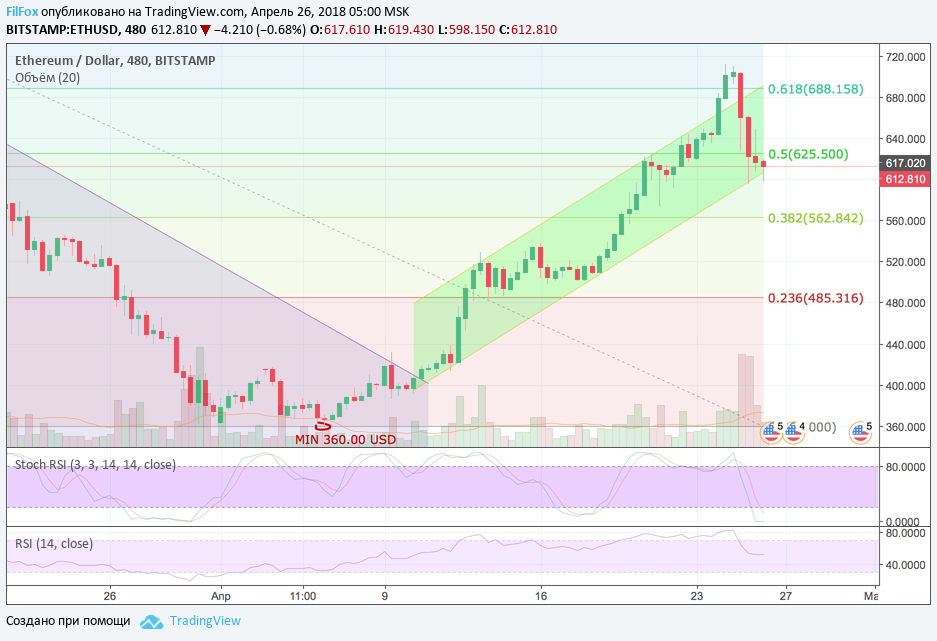 В точном соответствии нашему вчерашнему прогнозу, после максимума на отметке 711.00 USD, цена Ethereum откатилась к уровню поддержки 50% фибо (625.50 USD). В этой области эфир начнёт консолидацию, но вряд ли долго задержится на этом уровне. Показатель RSI находится в нейтральной зоне, а значит цена может продолжать снижаться, а может начать восстанавливаться, ведь стохастик показывает сигнал на покупку. Однако мы бы не советовали сейчас входить в рынок до того, как цена не консолидируется и не будет более четкого сигнала.