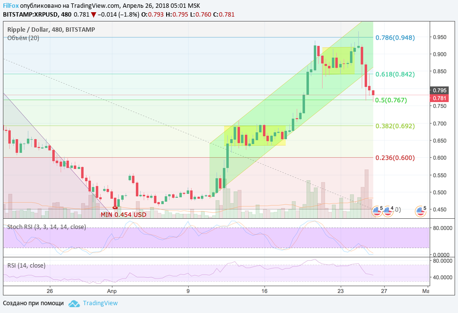 Но сегодня цена вновь протестировала 50% уровень фибоначи, установив локальный минимум на отметке 0.760 USD. Полагаем, что консолидироваться рипл будет именно в таком широком диапазоне, периодически проверяя на прочность поддержку и сопротивление.