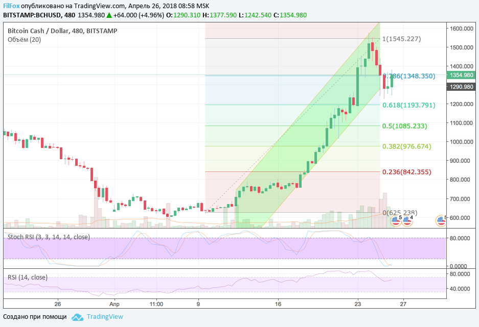 Сегодня получен сигнал стохастика на покупку и цена постепенно начала восстанавливаться к вчерашнему уровню, в область 1350.00 USD. Полагаем, что сегодня консолидация BCH будет проходить возле уровня 78.6% фибо (1348.35 USD). После окончания боковика не исключено дальнейшее снижение цены к уровню 61.8% фибо (1193.79 USD)