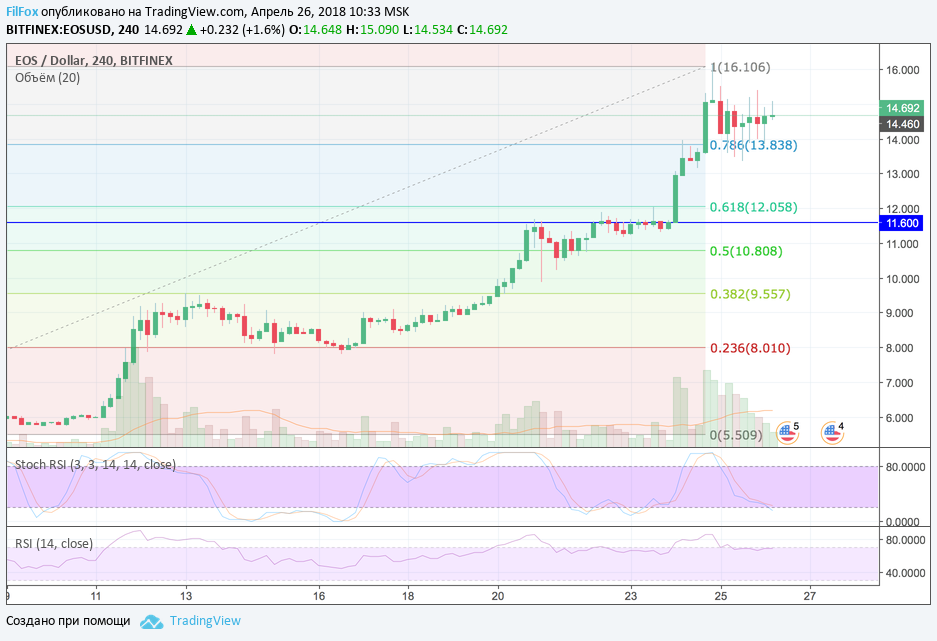 Легче всех вчерашний откат пережил EOS. После ре-теста уровня поддержки 78.6% (13.838 USD) цена начала стабилизироваться на уровне 15.60 USD. Можно сказать, что EOS уже выбрал себе этот уровень для дальнейшей консолидации.