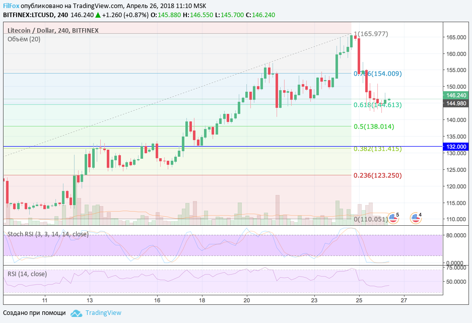 Больше остальных просел Litecoin. Вчера цена пробила сразу два уровня фибоначи и начала подавать признаки восстановления только после минимума на отметке 141.97 USD. Сегодня цена попыталась закрепиться над уровнем 61.8% фибо (144.61 USD). Полагаем, что после консолидации, снижение LTC продолжится и наиболее подходящим уровнем для входа в длинные позиции может оказаться линия на отметке 132.00 USD, если будет получен соответствующий сигнал стохастика на покупку. Этот уровень практически совпадает с 38.2% фибо (131.41 USD). Пара уже использовала его ранее как ключевой уровень поддержки при восстановлении.