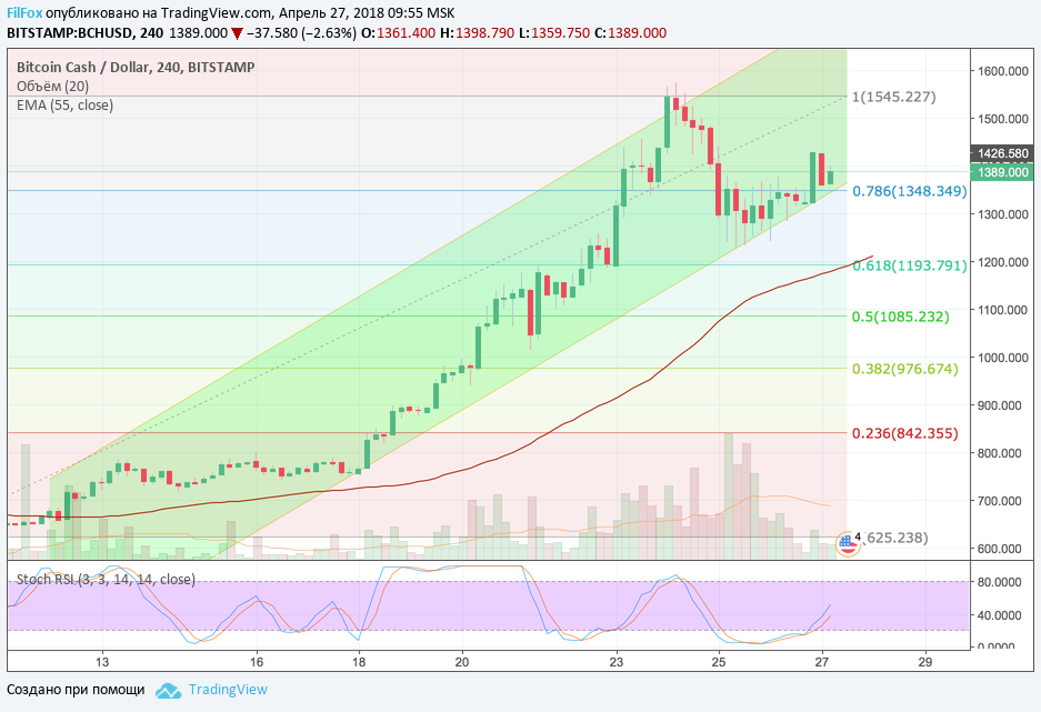 Bitcoin Cash вышел из консолидации, которая проходила под уровнем 78.6% фибо (1348.35 USD) и закрепился выше него, создавая платформу для дальнейшего роста.