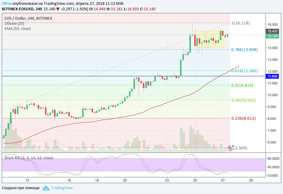 EOS вчера консолидировался на уровне 14.650 USD и сегодняшний бычий импульс заставил цену лишь протестировать верхнюю границу вчерашнего диапазона. Полагаем, что сегодня на малых и средних объёмах торгов, цена EOS продолжит свой боковик.