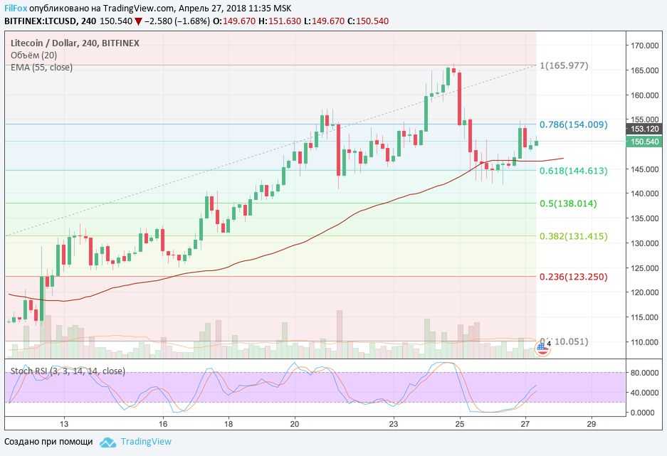 Litecoin вчера консолидировался над уровнем 61.8% фибо (144.61 USD) и под воздействием бычьего импульса цена протестировала 78.6% фибо (154.00 USD). Сейчас объём торгов очень скромный и цена без особого разброса консолидируется между этими двумя уровнями фибоначчи.