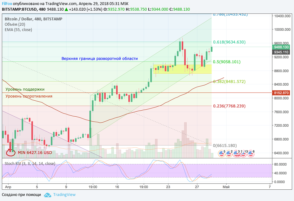 В среду, 25 апреля, когда цена протестировала 61.8% фибо (9634.63 USD), на подходе к психологической отметке «десять тысяч долларов», трейдеры начали фиксировать прибыль и большие объёмы продаж ожидаемо вернули цену BTC в пределы желтого диапазона.
