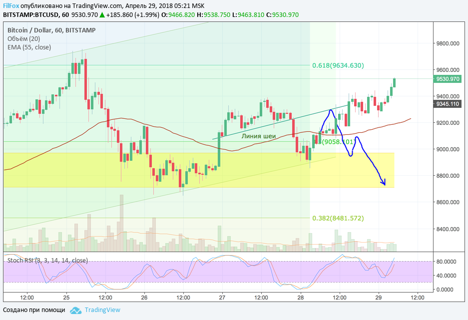 После непродолжительной консолидации, в диапазоне бывшего «прямоугольника», цена несколько раз ещё будет пытаться штурмовать «десятитысячник». Неплохая попытка была предпринята в субботу. Вместо технического отката в зону консолидации цена зацепилась за локальный максимум в районе 9442.00 USD и сегодня продолжила рост. Вот как это выглядело на часовом тайм-фрэйме: