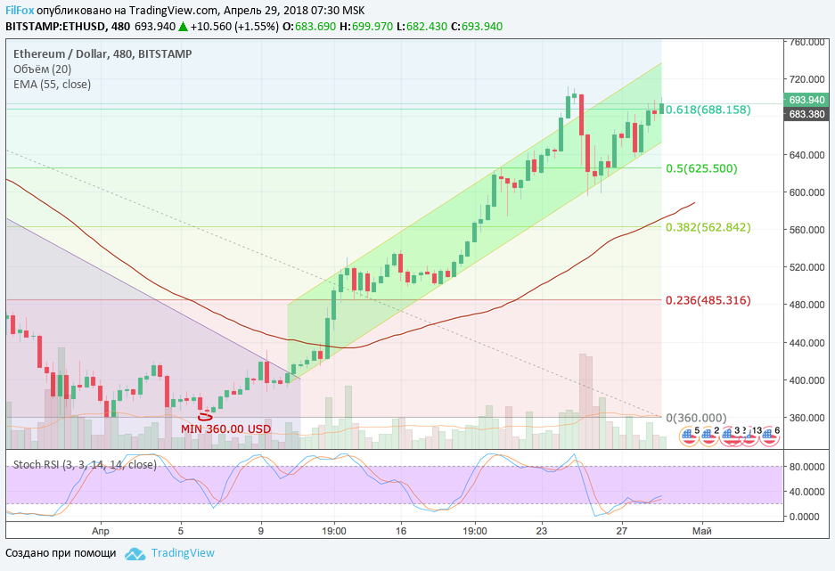 Вместе со всеми криптовалютами Ethereum «стартовал» во вторник и установил апрельский максимум на отметке 711.70 USD. Всю неделю эфиру так и не удалось передвинуть планку выше этой отметки. Наравне с остальными альткоинами, после отката, цена эфира консолидировалась в широком диапазоне между 50% и 61.8% уровнями фибоначчи. Вчера цена проколола сопротивление 61.8% фибо (688.16 USD), а сегодня пытается закрепится выше него. Но максимум вторника пока не преодолён.