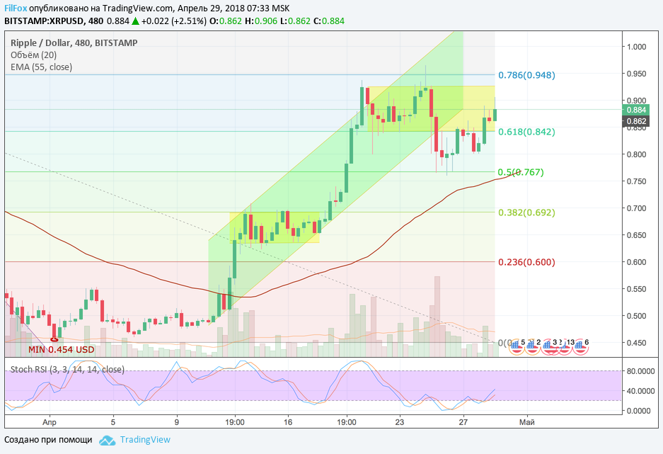 Ripple для консолидации использовал диапазон между 61.8% и 78.6% уровнями фибоначчи. Когда цена 25 апреля провалилась под уровень поддержки, то рипл изо всех сил пытался вернуться в этот диапазон. И только вчера эта попытка увенчалась успехом. Цена XRP закрепилась выше уровня 61.8% фибо (0.842 USD), пытаясь протестировать верхнюю границу диапазона консолидации. Если верить индикации стохастика, то это вполне по силам Ripple. Другой вопрос воспользуются ли трейдеры сигналом на покупку в данной ситуации на рынке.