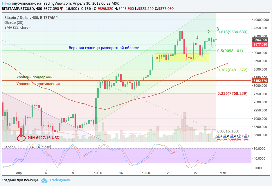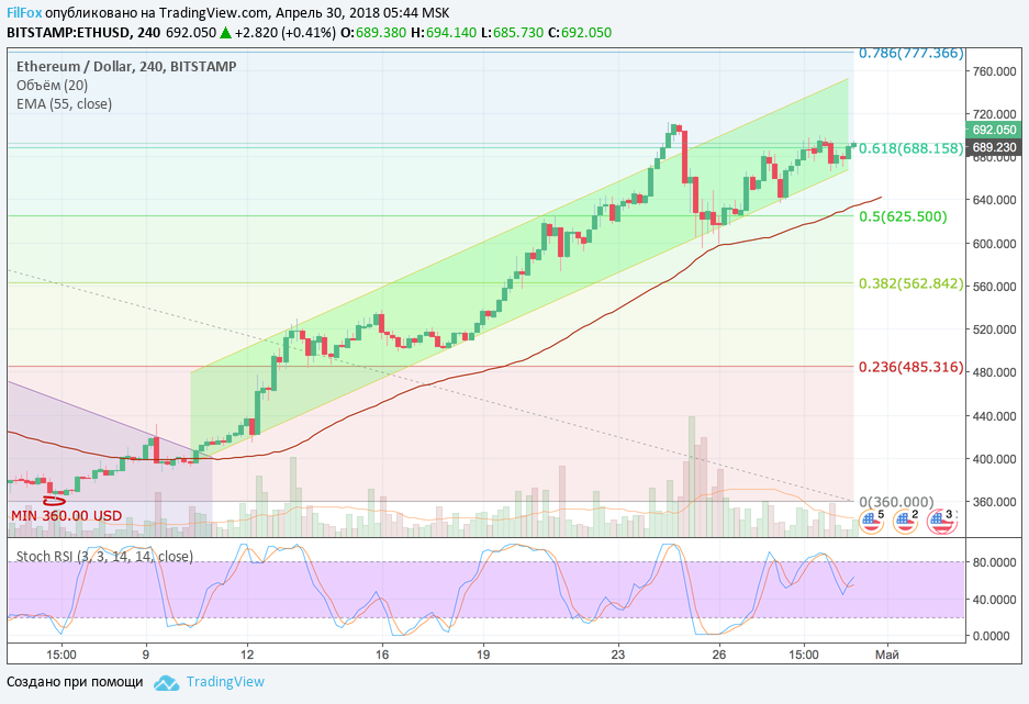 Аналогичная картинка с трёхволновой структурой вырисовывается и на четырёхчасовом тайм-фрэйме графика цены Ethereum. Прогнозное завершение третьей волны ожидается на уровне 720.00 USD. Будет ли эта отметка ещё апрельским максимумом или это произойдёт уже в мае, зависит от объёмов торгов. При таких малых объёмах цена может топтаться в боковом диапазоне, лениво подбираясь к максимуму довольно долго. Если, конечно, весь этот процесс не прервётся раньше большим объёмом продаж.