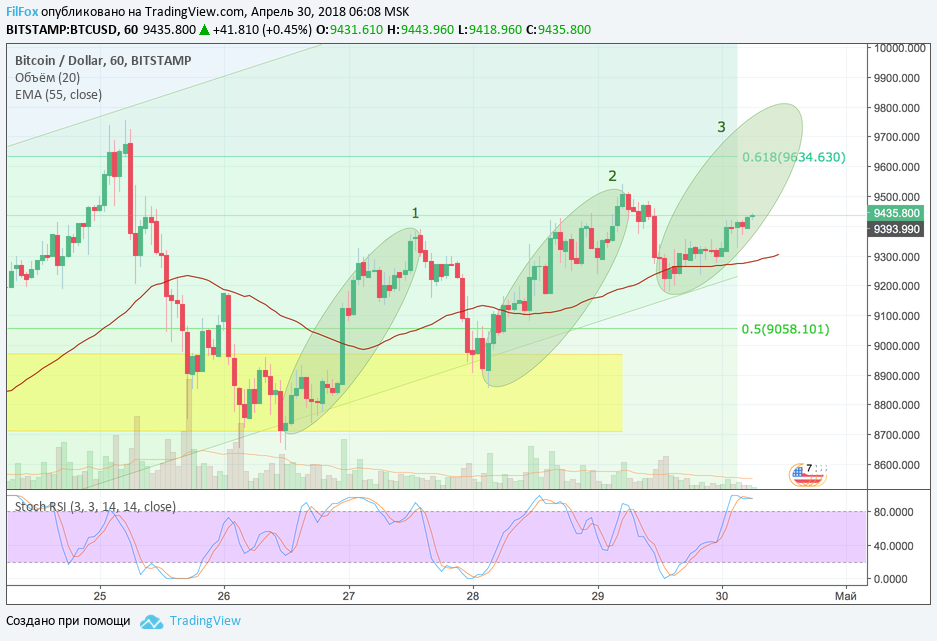 Вчера цена на Bitcoin установила дневной максимум на отметке 9538.75 USD и завершила вторую импульсную волну. Последовавший откат к нижней границе восходящего тренда зародил начало третьего завершающего импульса, который по идее должен закончится чуть выше 61.8% фибо (9634.63 USD). Полагаем третья волна должна завершиться в области 9800.00 USD. Однако учитывая малые объёмы, на которых вчера проходили торги, можно подумать, что третья волна может завершиться сразу после ре-теста уровня сопротивления фибоначчи 61.8%.