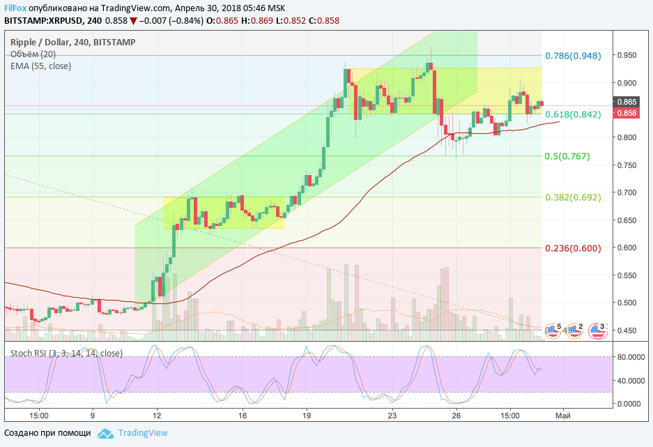 У Ripple просматривается похожая ситуация с трёхволновкой, но судя по объёму, цена вряд ли сможет «дорисовать» классическую третью волну. Её завершение, по идее, должно находится на верхней границе желтого прямоугольника - 0.92 USD. Но так как высоковолатильные волны крипты особо не придерживаются классических форм, то надеяться на апрельский максимум в этой точке, не приходиться.