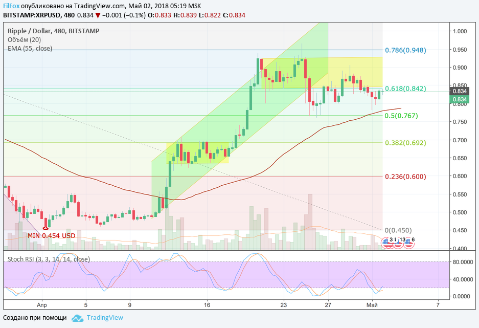Вчера, после минимума 0.782 USD (вблизи EMA55), цена восстановилась под уровень 61.8% фибо (0.842 USD). Несмотря на постоянный рост участников сети RippleNet эти положительные фундаментальные события пока не влияют на динамику рипл, поэтому преодоление сопротивления 61.8% фибоначчи выглядит маловероятным. Сегодня предполагается консолидация между этим уровнем сопротивления и уровнем поддержки 50% фибо (0.767 USD).