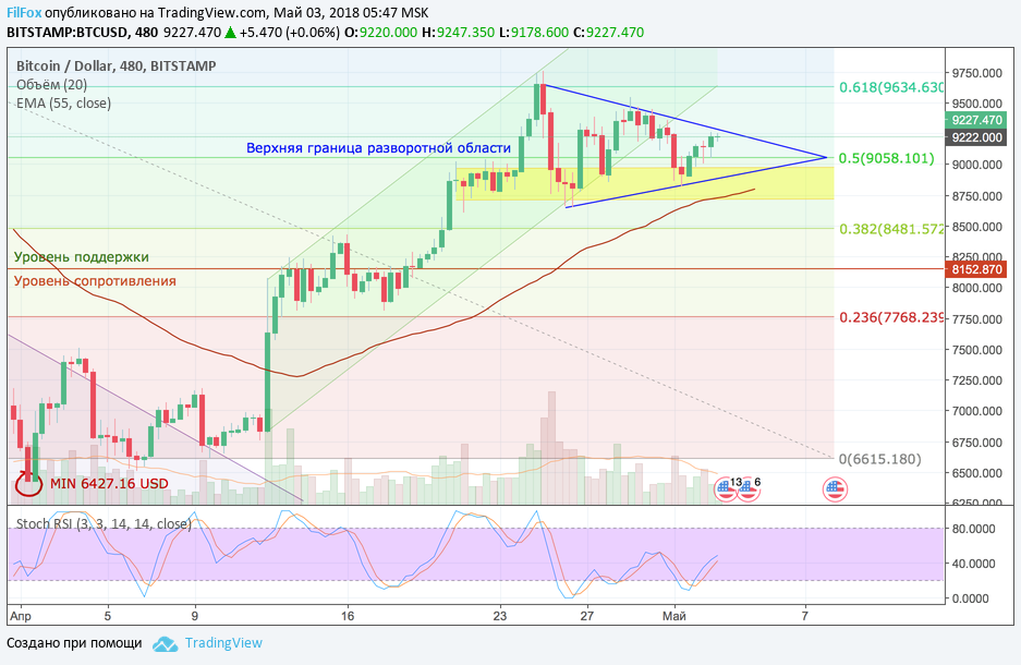 Во время вчерашней консолидации цене Bitcoin удалось закрепиться выше уровня сопротивления 50% фибо (9058.00 USD). На графике цены можно выделить фигуру продолжения тренда - «Вымпел».