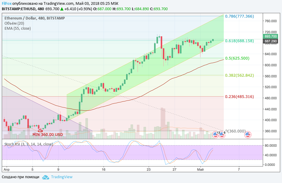 Ethereum весь вчерашний день провел в консолидации, пытаясь преодолеть уровень сопротивления 61.8% фибо (688.15 USD). Сегодня цена преодолеет этот уровень сопротивления и установит новый максимум. Это первый максимум мая, который должен превысить апрельский, находящийся на вершине 711.70 USD. В завершении дня цена откатится в область 700 долларов за эфир.