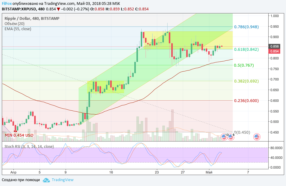 Вчерашняя консолидация возле уровня 61.8% фибо (0.842 USD) привела к тому, что цена закрепилась выше этого уровня и вошла в пределы желтой зоны консолидации. Сегодня ожидаем рост цены к верхней границе желтого прямоугольника и ре-тест уровня сопротивления 78.6% фибо (0.948 USD). После этого цена вновь откатится в желтую область консолидации.
