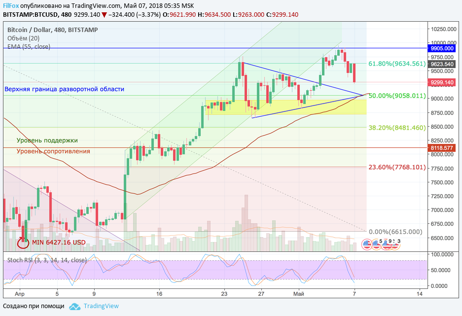 Наше предположение относительно ре-теста верхней границы "Вымпела" подтверждается. Уровень 61.8% фибо (9634.00 USD) не смог удержать цену в боковике. И даже развернул пару BTC/USD, когда она попыталась вчера восстановиться. Полагаем, что пересечение скользящей средней EMA55 с уровнем 50% фибо (9058.00 USD) окажет цене двойную поддержку и послужит местом консолидации Bitcoin.
