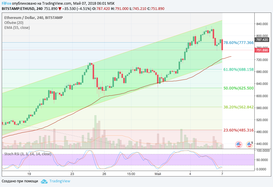 Вчера Ethereum смог зацепиться за уровень поддержки 78.6% фибо (777.36 USD). Но сегодня снижение продолжилось с новой силой. Поэтому наше предположение, что скользящая средняя EMA55, которая сейчас проходит в районе 720 долларов за эфир, окажет цене поддержку, по прежнему актуально. Вполне возможно, что эту область цен ETH использует для кратковременной консолидации.