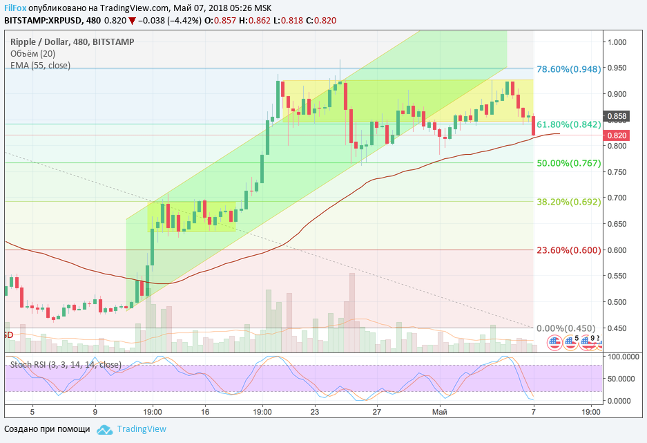 Вчерашний прогноз по Ripple оказался правильным. Паре XRP/USD, действительно, вчера удалось удержаться в пределах желтого коридора боковика. Но начало этой недели похоже на вторник, а не понедельник прошлой. Сегодня цена не смогла консолидироваться на уровне 61.8% фибо (0.842 USD) и продолжила падение. Полагаем, что снижение рипл будет сопоставимо с первомайскими распродажами и, как в прошлый вторник, достигнет уровня 50% фибо (0.767 USD).