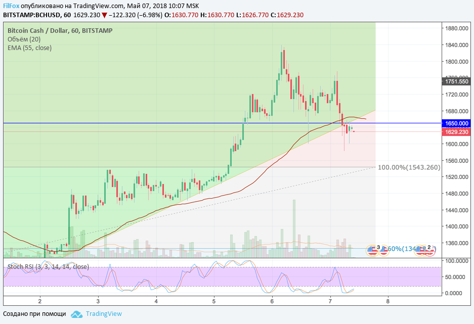 Субботний максимум пара установила на отметке 1755.00 USD, а в воскресенье отметилась на уровне 1839.00 USD. Сейчас же цена BCH/USD возвращается на стартовый уровень прошлой субботы, к поддержке 100% фибо (1543.26 USD). Уровень 1650.00 USD, который ранее выступал поддержкой, сейчас играет роль сопротивления, и даже с четвёртой попытки цена не смогла его преодолеть.