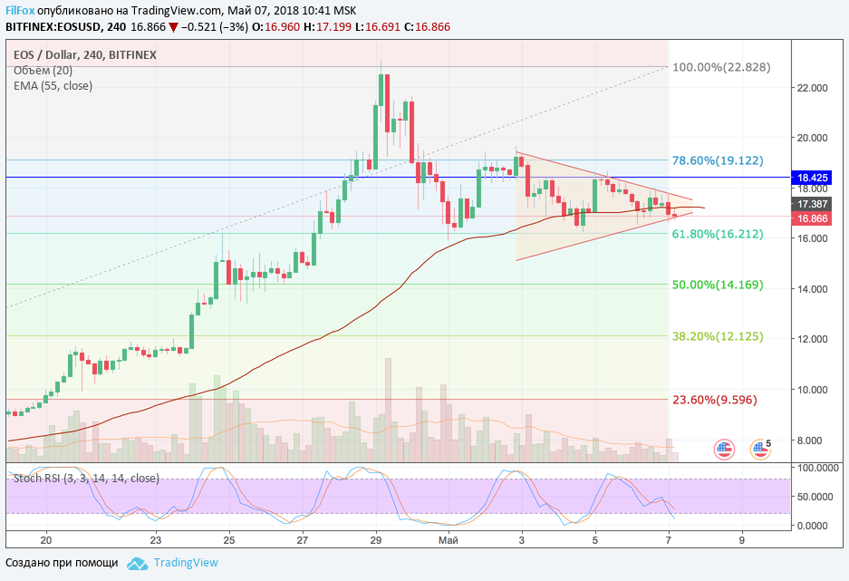 После первомайского снижения, цена на токены EOS остаток прошлой недели консолидировалась между двумя уровнями фибоначчи 61.8% и 78.6%. Сейчас EOS не может преодолеть сопротивление 17.777 USD и снизился к уровню средних цен на четырёхчасовом тайм-фрэйме. Как и прежде, трудно сказать какой импульс будет первый при выходе из сужающегося диапазона. Исходя из технического анализа можно предположить медвежье направление с прорывом уровня 61.8% фибо (16.21 USD)