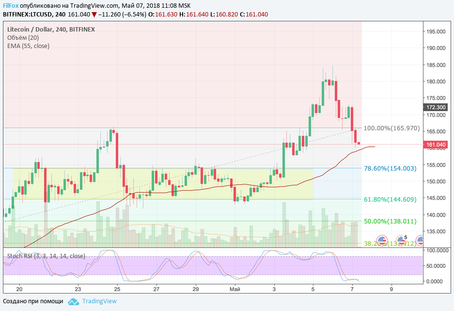 Litecoin в выходные отработал целевой уровень 180 долларов США и установил максимум на отметке 184.70 USD. Индикатор стохастик в зоне перекупленности нарисовал сигнал на продажу и тем, кто покупал по нашему совету от уровня 78.6% фибо (154.00 USD), нужно было закрывать лонги при достижении целевого уровня, о котором мы говорили в своём прогнозе.