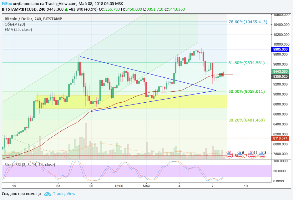Вчера снижение цены Bitcoin было остановлено в точке минимума 9175.00 USD. Таким образом цена пары развернулась всего в нескольких долларах от нижней границы Вымпела и консолидировалась возле скользящей средней EMA55, которая на четырёхчасовом тайм-фрэйме, проходит в районе цен 9400.00 USD.